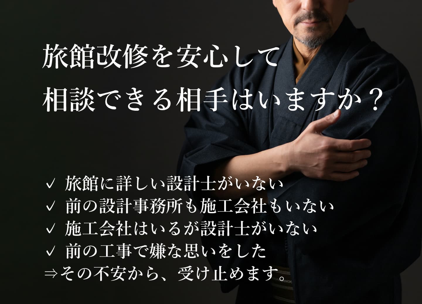 旅館リノベーションに対するオーナー様のお困り、悩み、不安を『旅館リノベーションの知識経験が豊富な一級建築士』が解消、解決します!